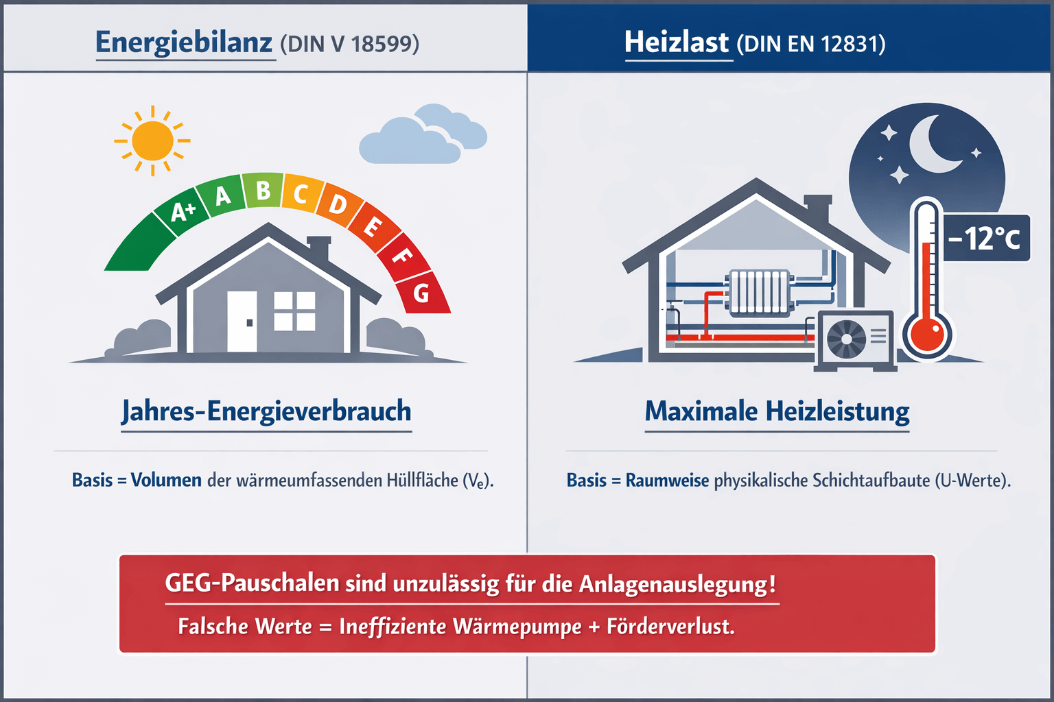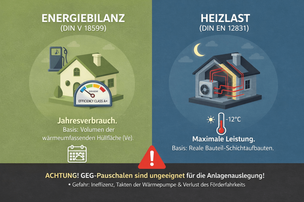 Eine Bilanz kann mit mittleren Gewinnen/Verlusten arbeiten. Die Heizlast fragt: Was passiert, wenn’s draußen richtig kalt ist? Genau dann muss die Anlage funktionieren – ohne „im Mittel scheint ja auch mal Sonne“.